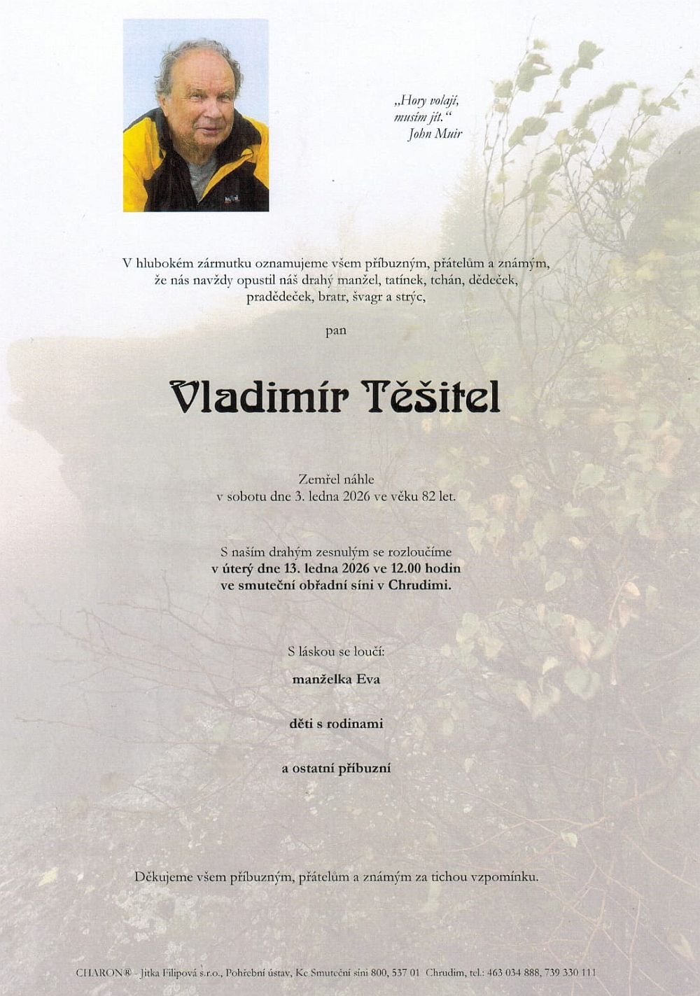 Poslední rozloučení s Ťěšou bude v úterý 13. ledna 2026 ve 12:00 ve smuteční obřadní síni v Chrudimi.