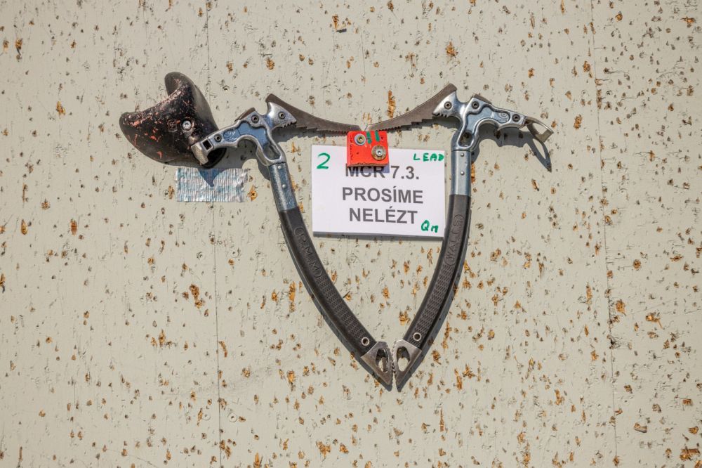 Oliver Hamerský a jedna ze sázek, přelez kvalifikační cesty s již „historickými cepíny DMM Predator“, na horních kamenech neprošlo