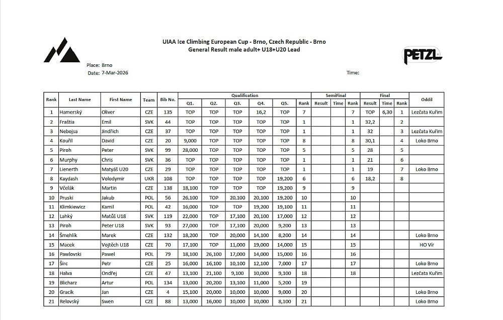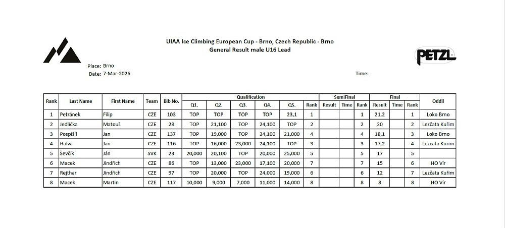 Letos byla bohužel kolize s posledním závodem EP UIAA ve finském Oulu, takže někteří z českých závodníků dali přednost tomuto poslednímu mezinárodnímu závodu. Mimo bohatou účast dospělých (na danou disciplínu) je velmi potěšující především účast v nejmladší kategorii U16, kde se představilo 8 chlapců a 7 dívek, což potvrzuje rostoucí zájem mladé generace o závodní ledolezení.