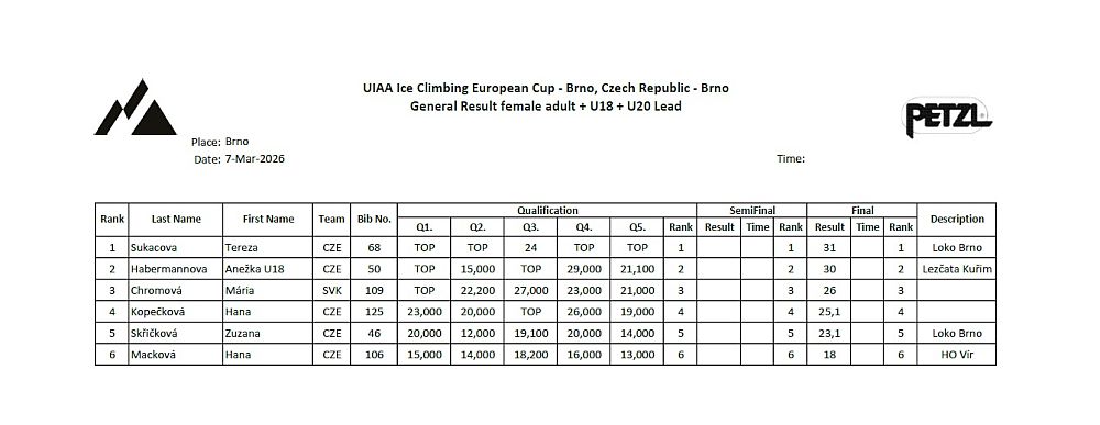Děkujeme a těšíme se na další kolo Českého poháru v ledolezení na obtížnost. Předpokládáme termín v druhé polovině října 2026. Tento závod bude také součástí nominačních kritérií do reprezentace na sezónu 2026/2027.