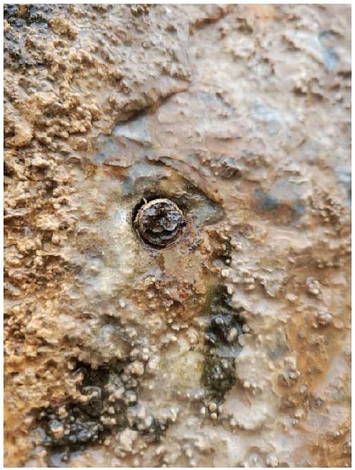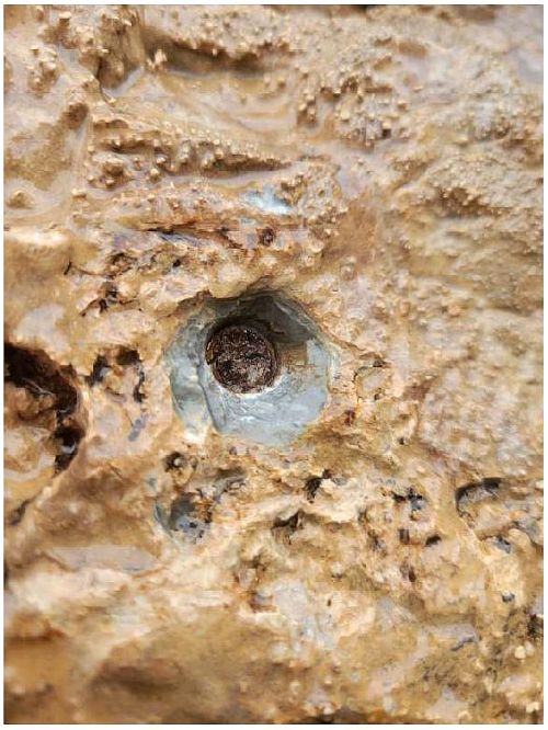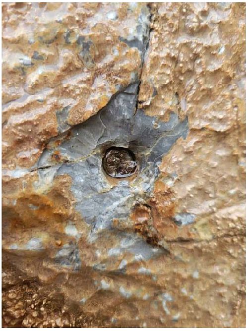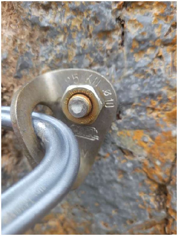 Nýt č. 3 (níže pod bodem): Tento prvek byl nalezen zlomený, podobně jako slaňovací bod.