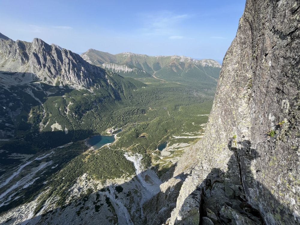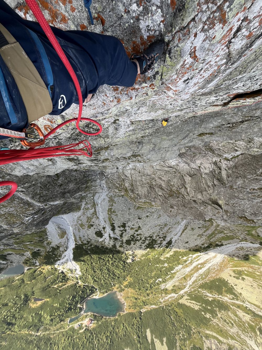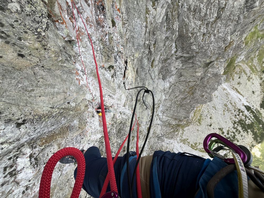 Střih. 28. 8. ráno nastupuju do Superdiretissimy sám, tedy úplně sám nejsem. Je se mnou svině a pěkně těžká – 4 litry vody, 2 lana (singl a půlka), friendy, vklíněnce, expresky, karabiny, blokanty, teplé oblečení, spacák, karimatka, vaření a jídlo. Cesta je na tatranské poměry dlouhá, má 13 délek plus dolez na vrchol Pavúkove veže. Při jištěném sólu je navíc potřeba každou délku vylézt, zafixovat lano na štandu, při slaňování vybírat některé jištění a některé nechat a refixovat na nich loďákem lano, aby při následném žumarování se neprodřel oplet, resp. refixování je nutné také pro diagonální a traverzové délky. Po slanění na původní štand se zruší a žumaruje s tahačákem zpátky nahoru.