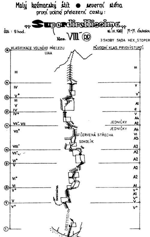 PS: Klasifikace se diskutovala na webu. V původním topu volného přelezu Coubalovců je 8(-?). Pak se něco ulámalo. Miro Peťo udělal první přelez a „díky“ komentářům na webu navrhnul opatrné 9-/9. První opakování udělal Michał Czech a hodnotil 9. Druhé opakování jsme udělali s Maťom a ten navrhoval taky 9. Nicméně ta cesta není jen o této délce, resp. je velmi komplexní, kdy pouze devítková výkonnost (pro nás sportovní lezce) nestačí…