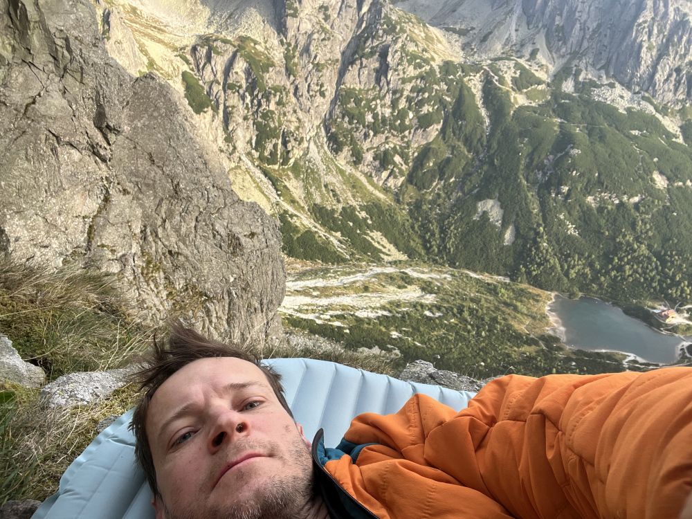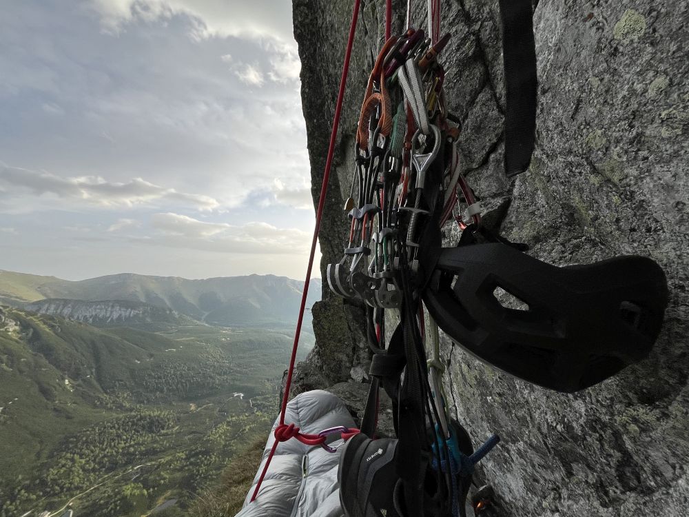 Takže pokračuji ve svém větrném tunelu. Pod sedmou délkou, kde je šikmá police, dorazím brzo, takže nechávám svini napást na kousku tatranské trávy a lezu dál. Vylezu a zafixuji si další dvě délky. Pak romantika na nafukovací skluzavce v noci, jelikož police je sice dobrá, ale ubíhá ve dvou směrech. Kromě jištěného spaní v sedáku si proto dělám i smyčku na nohy.