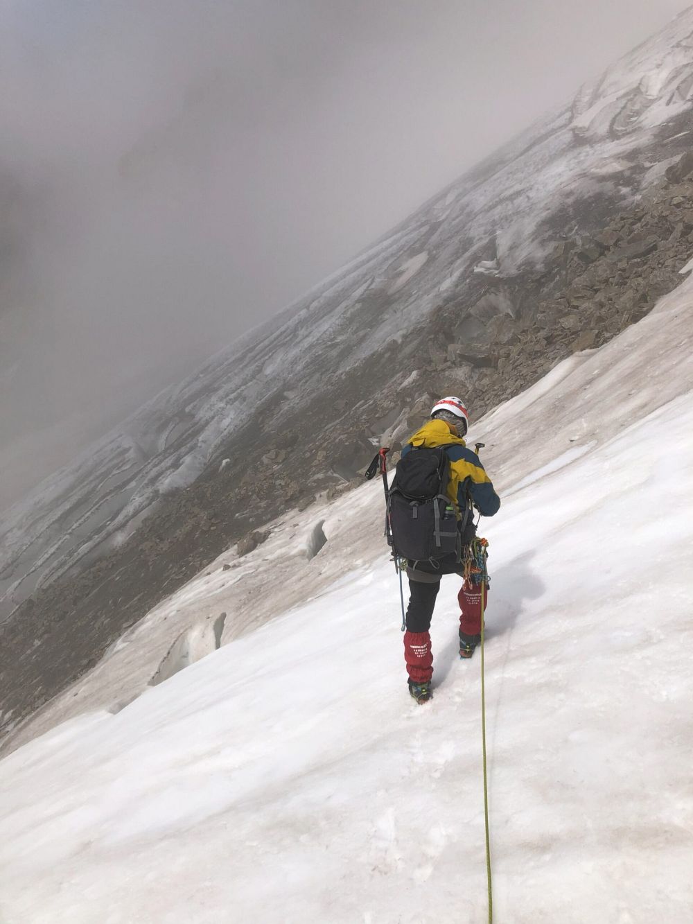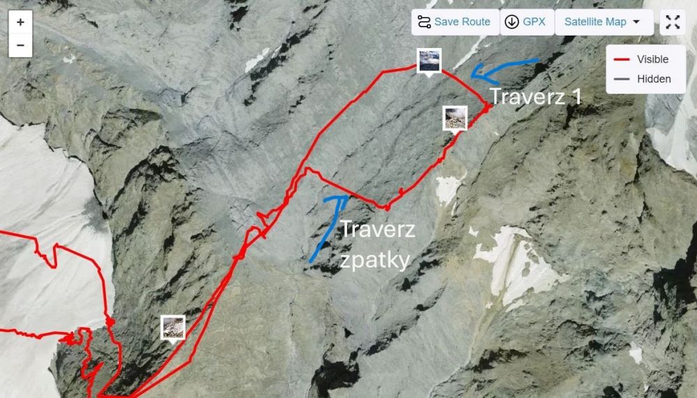 Po krátké přestávce se vydáváme po takovém “ridgi” směrem nahoru a tady děláme navigační chybu, bohužel jsme příliš vlevo a mineme “mužíka”, který značí místo, kde se má odbočit vpravo do traverzu. Ten by nás navedl k lezecké části výstupu, ale my jsme příliš vysoko, odbočku míjíme a náš traverz plus hledání cesty trvá příliš dlouho.