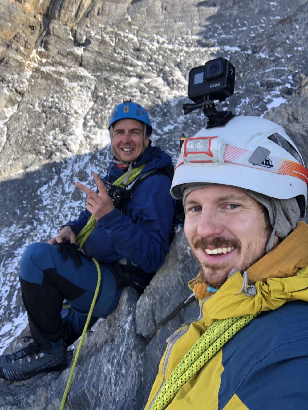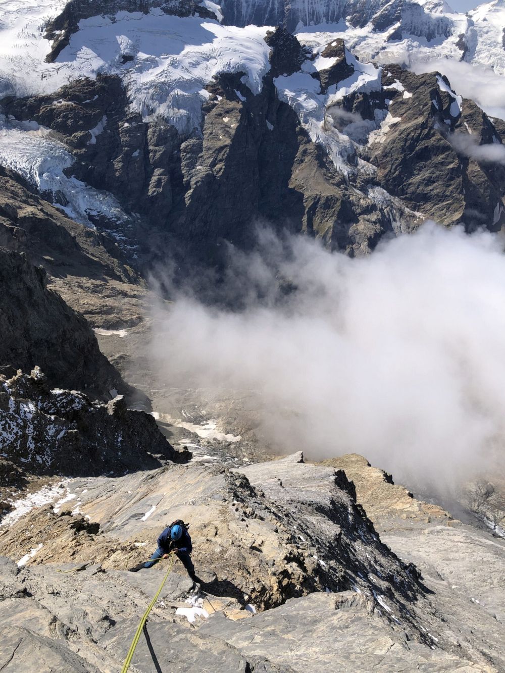 Otáčíme to nějakých 300 výškových metrů pod vrcholem. Cesta dolů není zadarmo. Zaseknuté lano, které Janek musí vysvobodit a opětovné hledání cesty dolů má svoje úskalí. Sestup má ovšem z našeho pohledu i výhody. Sestupujeme jinudy, než jsme šli nahoru, a tak objevujeme jistící tyče, borháky a další vymoženosti, které nám cestou dolu dělají radost.