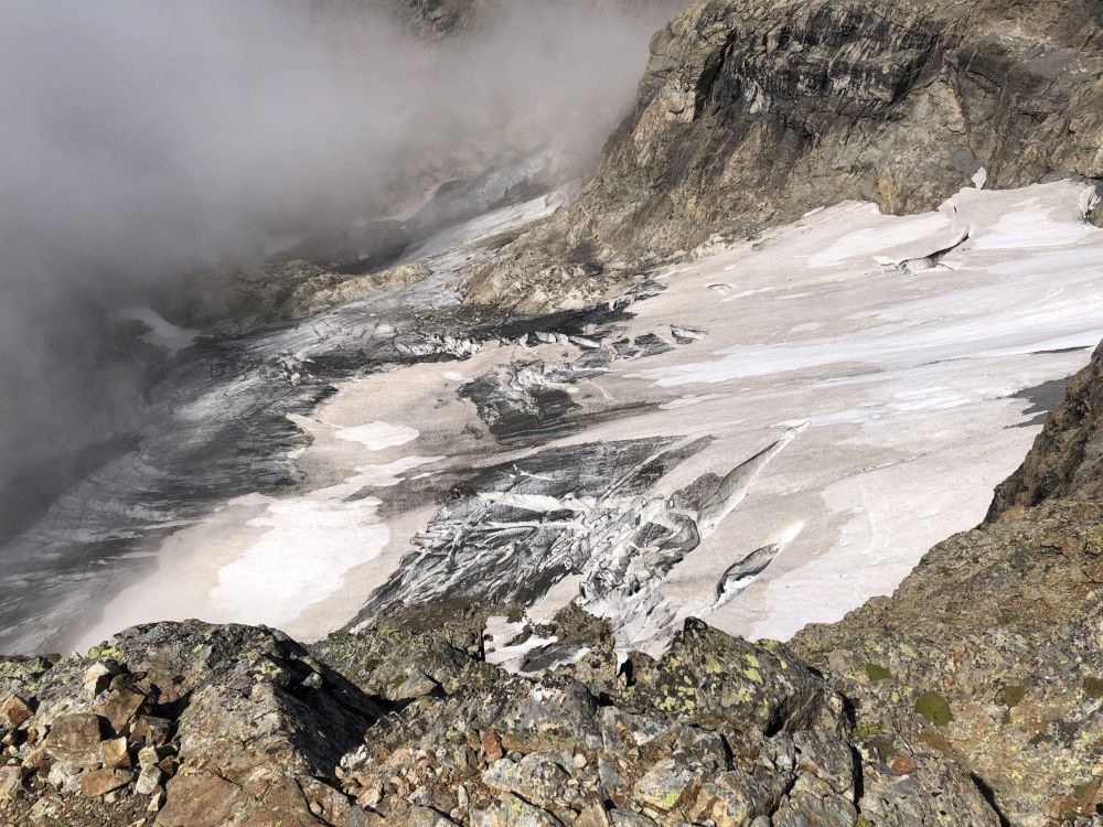 Dá se říct, že tady začínají naše lehké navigační problémy. Obě skupinky nám utekly a žádná čitelná cesta přes ledovec nevede. Zvolíme opět delší, ale o to trošku horší cestu. Nastoupáme na ledovci nahoru, abychom se vyhnuli trhlinám, opravíme padající mačky, obejdeme trhliny a dostáváme se na tzv. “frühstücksplatz”.