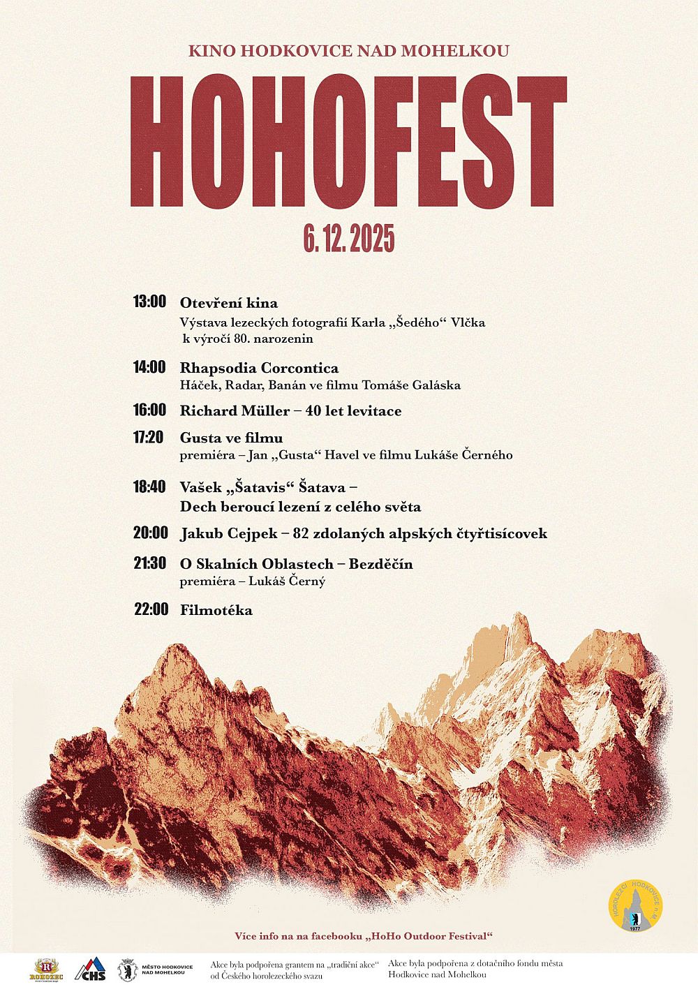 V sobotu 6. 12. 2025 od 13. hodiny začne další horolezecký festival v Hodkovicích nad Mohelkou. Po celý festival si můžete v klidu prohlížet fotografie Karla Vlčka. Ve filmech Lukáše Černého se projdeme po skalní oblasti Bezděčín a opět nahlédneme do života "Gusty" Jana Havla. Vašek Šatava zavzpomíná na úžasné lezení po celém světě, Jakub Cejpek nás naladí k výstupům na alpské čtyřtisícovky.