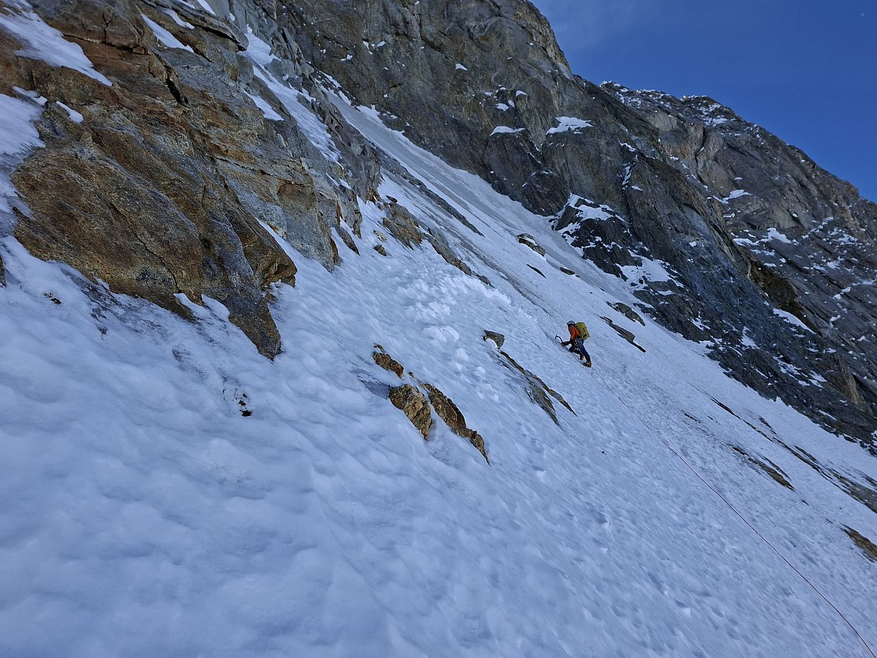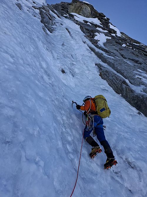 Jako tvrdý oříšek se ukazuje překonání odtrhové trhliny. Traverzujeme asi 100 metrů doprava, kde to vypadá schůdněji. Po pár pokusech o přelez trhliny sundávám batoh, s ním to fakt nepůjde. To nám to pěkně začíná. V převislé stěně z měkkého sněhu, která následuje vzápětí, se mi ruka s cepínem boří po rameno a sotva dýchám. Následuje další převis, tentokrát z tvrdého vodního ledu. Tam jdou naštěstí alespoň zavrtat šrouby. Pak se terén na chvíli zkulturní a my valíme jednu délku za druhou. Většinou jde o lezení v dost tvrdém ledu, ve kterém nám ale rychle ubývají síly.