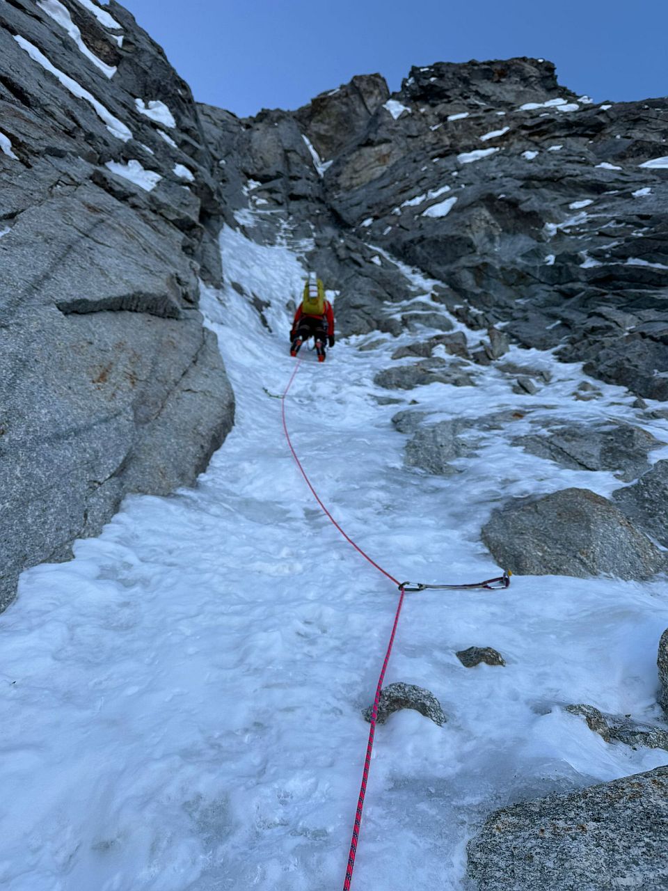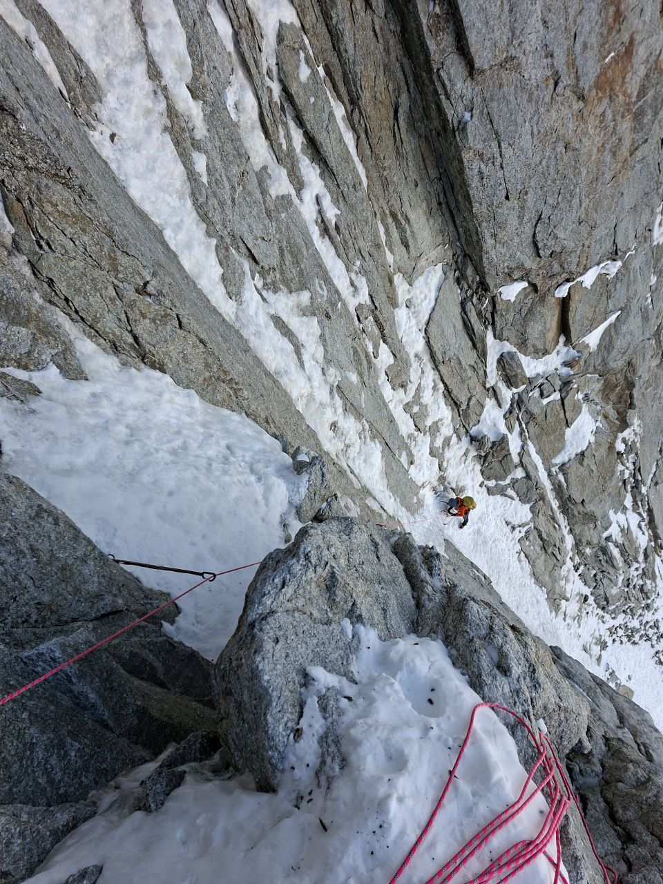 Ráno pokračujeme v ledových délkách na poslední ledové pole. Odtud vede zářez na pilíř, kde začínají délky v rozbité skále. Traverzujeme doprava do výlezu koutem, který je podle průvodce nejlepší variantou ukončení cesty. Jenže tady zas pro změnu není vůbec led. Takže opět traverz zpátky na pilíř. Po pár délkách ve skále se ocitáme v převislé skalní stěně. Zase špatně.