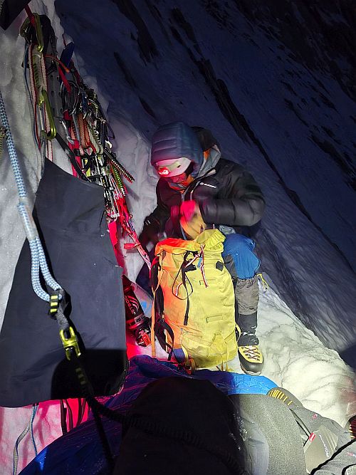 Tma nás zastihne zhruba v polovině stěny, čeká nás druhý bivak. V 70° firnu se nám podaří vykopat plošinu, na kterou se oba tak napůl natáhneme a snažíme se doplňovat kalorie a síly.