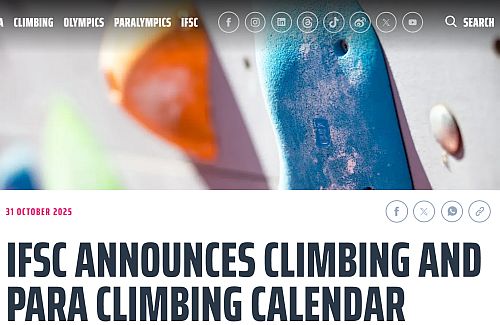 Mezinárodní federace sportovního lezení (IFSC) představila kalendář závodů na rok 2026, který obsahuje 9 světových pohárů, včetně závodu v boulderingu a v lezení na laně 4.–7. června v Praze, a pak ještě tři závody v paralezení a jedno mistrovství světa mládeže. ... celý článek