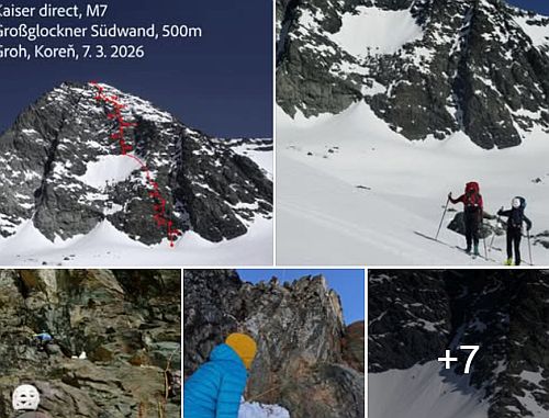 Prvovýstup Kaiser Direkt v jižní stěně Grossglockneru. Juraj (Ďurifuk) dolézá 1. délku nad sněhovým polem.
